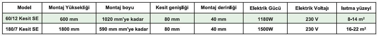 | Güç gereksinimi: Tek faz, 220v – 230v. IP44 sınıfına göre nem korumalı. Seçili modellerde IP64 sınıfına göre partikül koruması. Termostat göstergesi ile yüzey sıcaklığı kontrol edilir.Panel boyutu seçenekleri: 600 mm uzunluk x 1020 mm’ye kadar genişlik. 1800 mm uzunluk x genişlik 590 mm’ye kadar. Maksimum yüzey sıcaklığı: 60°C. Malzeme: Alüminyum. Tüm elektrikli bileşenler için 3 yıllık koşullu garanti ile birlikte gelir. |