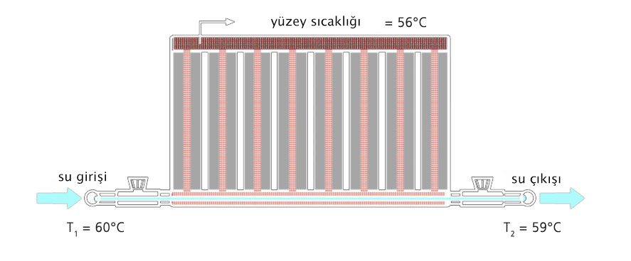 60 °C’lik bir akış sıcaklığında, yaklaşık 56 °C’lik bir ısıtma sıcaklığına ulaşılır.